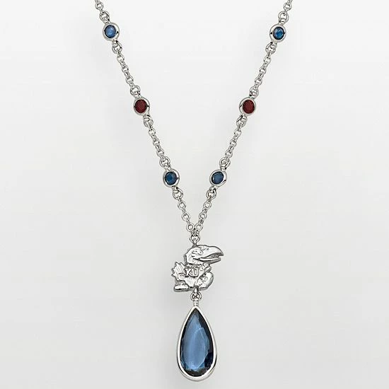 Athletic, yet elegant. This Kansas Jayhawks Y necklace features a team logo link, and blue and red crystals. Add eye-catching appeal to your game day attire with this silver-tone necklace.