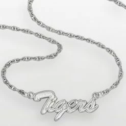Show your spirit with this LSU Tigers sterling silver script necklace. The “Tigers” nameplate provides a fashionable style. Have a winning look on game day or any day with this sterling silver script pendant.